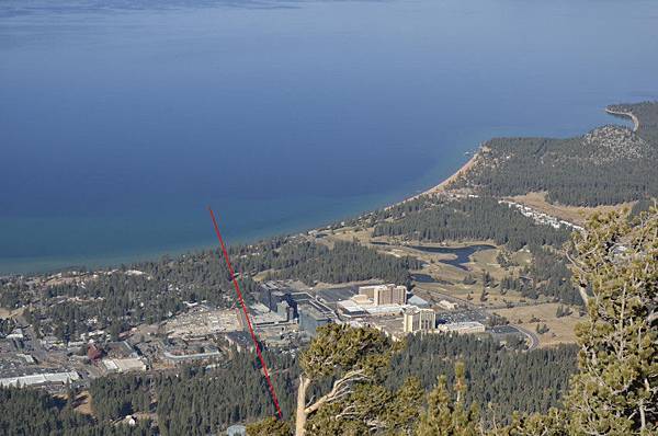 紅線就是州界囉,右邊是內華達州,過一條馬路馬上就是賭場、飯店林立,加州這邊反而很多汽車旅館,哈~